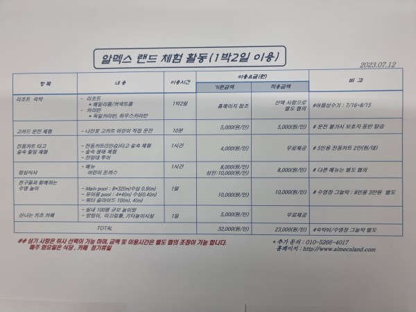 - 고카트 운전 체험 , 전동카트 숲속 힐링체험, 수영놀이, 키즈 카페 등
